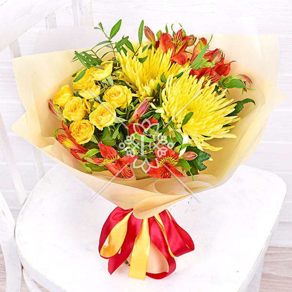 Шикарные солнечно-желтого цвета одноголовые хризантемы прекрасно сочетаются здесь с нежной алого цвета альстромерией и прекрасной кустовой розой желтого цвета. Вся цветочная композиция будто пропитана солнцем!
