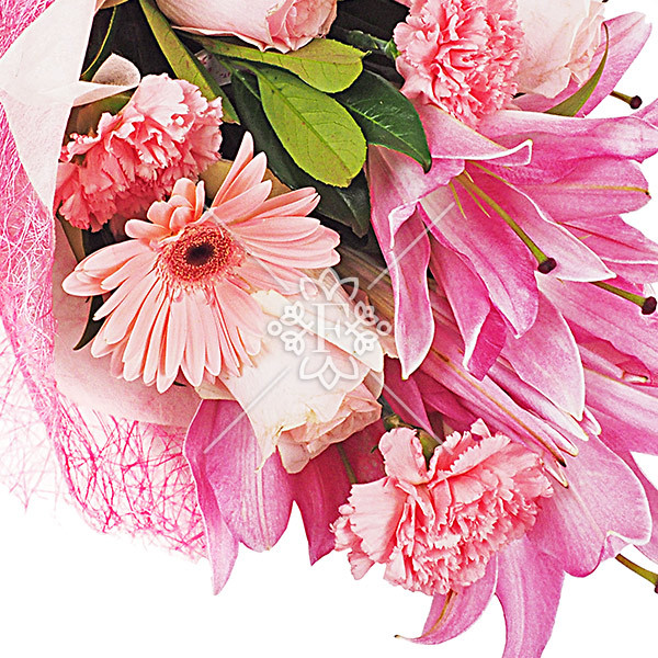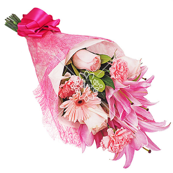 лилия розовая - 1 шт, гербера розовая - 2 шт, роза розовая - 2 шт, гвоздика розовая - 2 шт, упаковка, бант розовый.